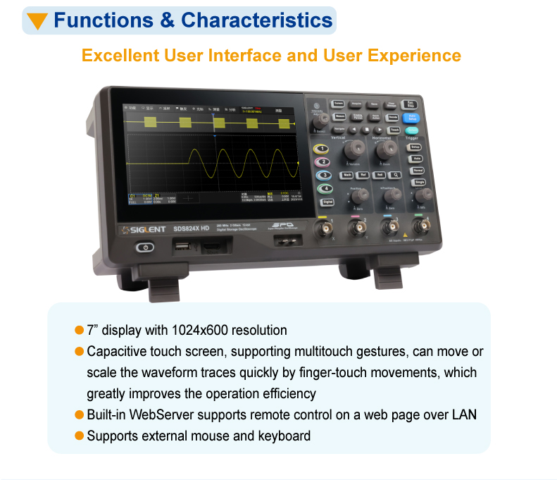 * Intelligent trigger: Slope, Pulse width, Window, Runt, Interval, Dropout, Pattern, Video (HDTV supported), ualified, Nth edge,