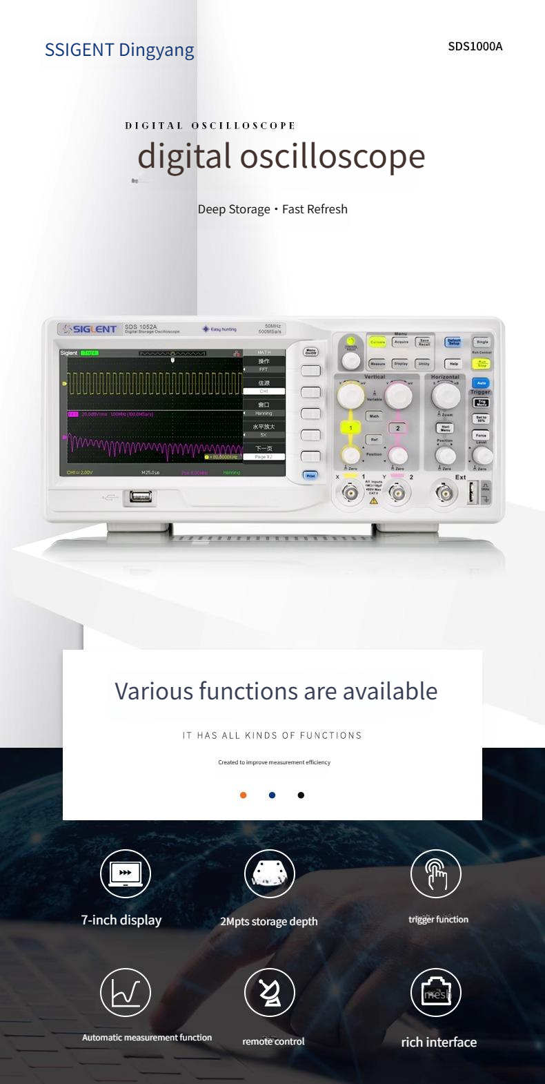SDS1072A, SDS1102A, SDS1152A With deep storage mode, storage depth up to2 Mpts. AndSDS1000A The entire series has a one-keyZoom
