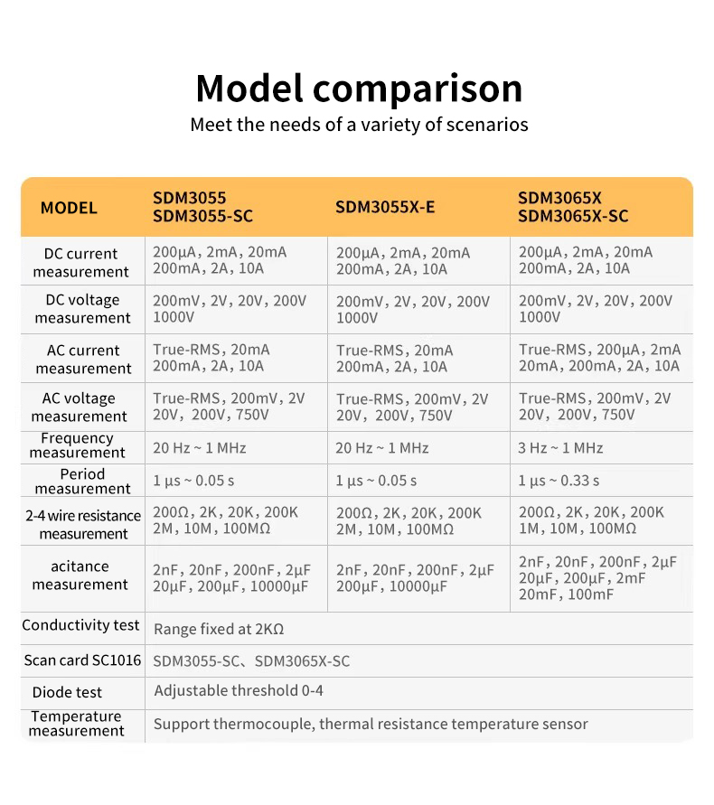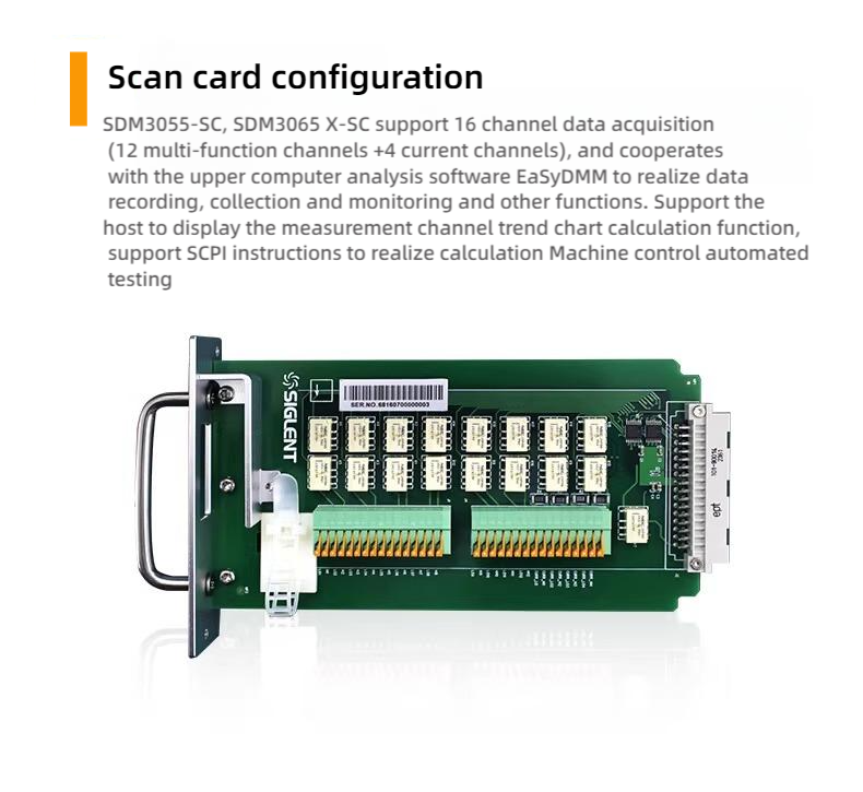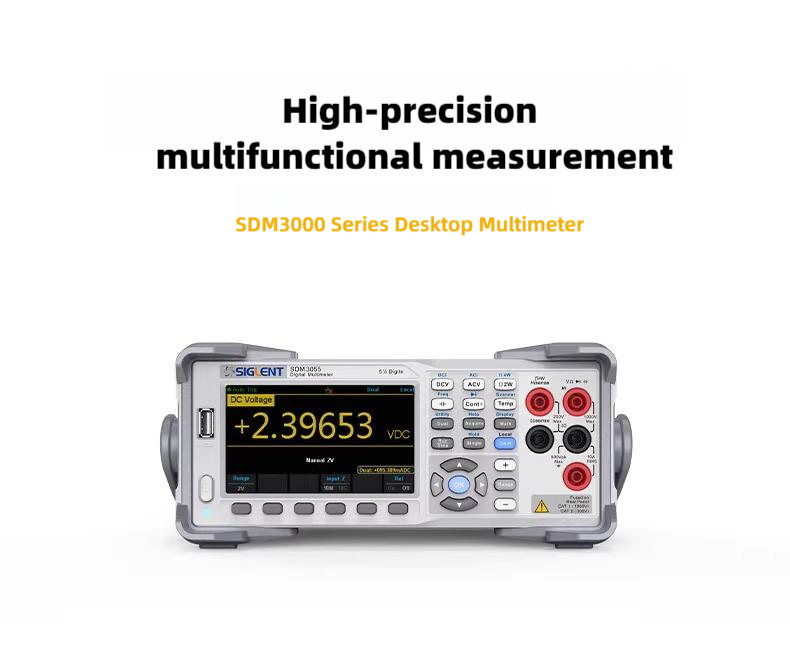 The SDM3055/SDM3055 - SC digital multimeter offers high measurement performance with 5½ - digit resolution (240,000 counts), true- RMS AC voltage/current measurement, and a fast 150 rdgs/s speed. It has rich functions including various basic measurements and math operations. User - friendly features include a 4.3 - inch TFT - LCD dual display, multi - language menus, U - disk/local file management, EasyDMM software, and remote SCPI control (SDM3055 - SC), suitable for multiple scenarios. Hardware - wise, it has 1GB flash storage, built - in cold junction compensation, standard interfaces (USB Host, LAN) with an optional USB - GPIB adapter,ensuring accuracy and convenience.