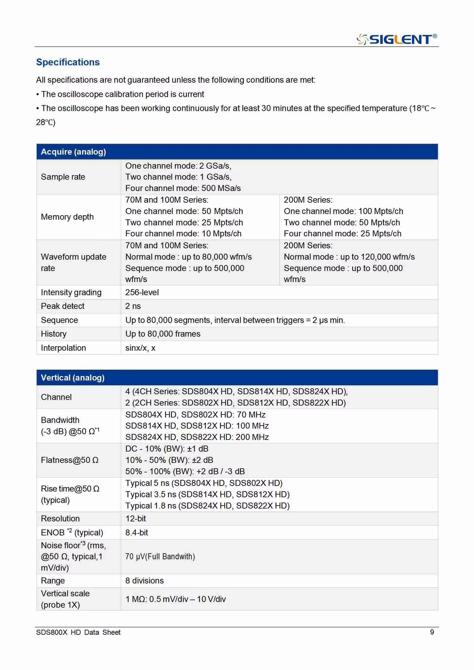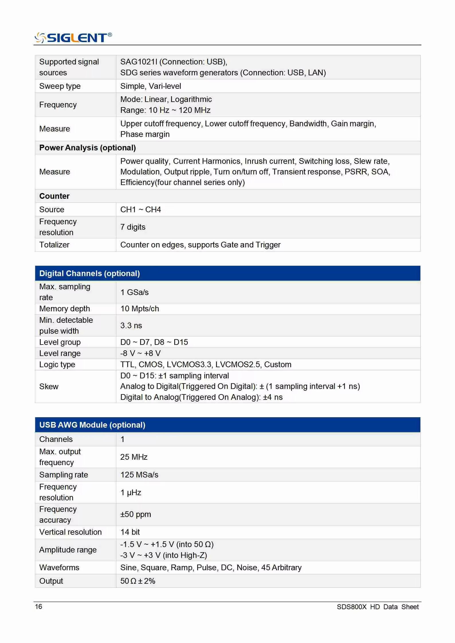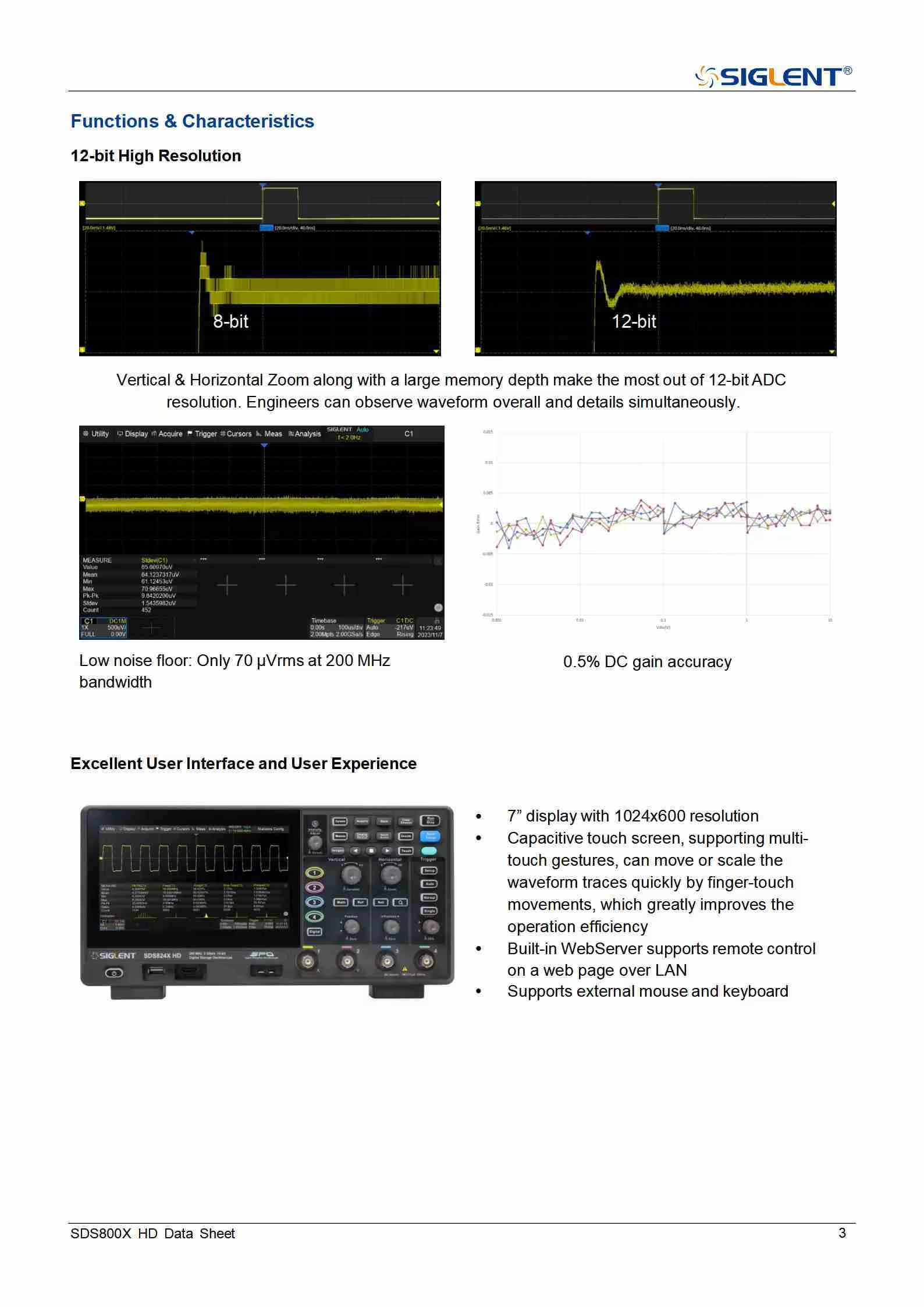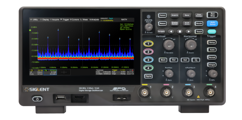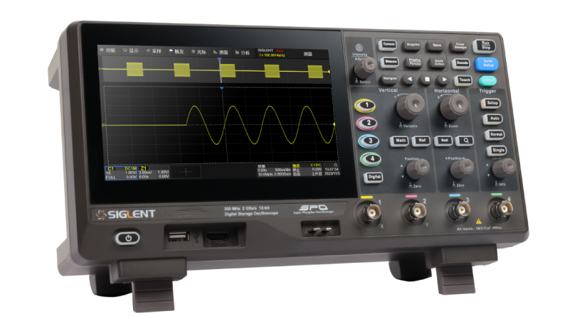 The SIGLENT SDS800X HD series is a high-resolution digital storage oscilloscope. It is built on 2 GSa/s, 12-bit Analog-Digital Converters with excellent front-end noise performance. Available in bandwidths of 200 MHz, 100 MHz, and 70 MHz, it offers a maximum record length of 100 Mpts and features 2/4 analog channels + 16 digital channels for mixed-signal analysis.