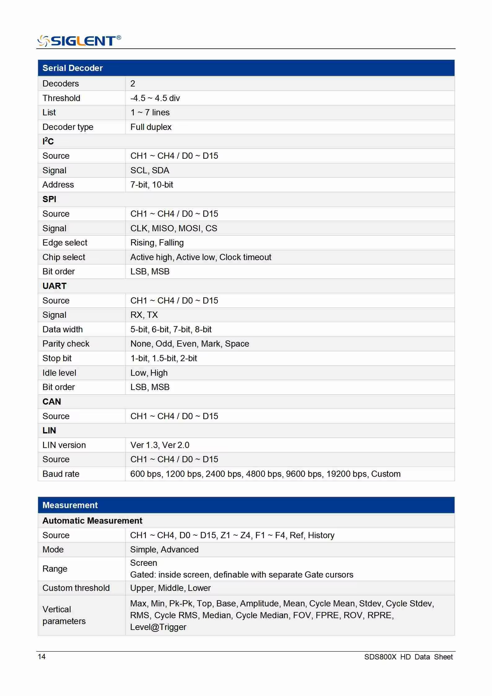 * Serial bus triggering and decoder: supports protocols I²C, SPI, UART, CAN, LIN