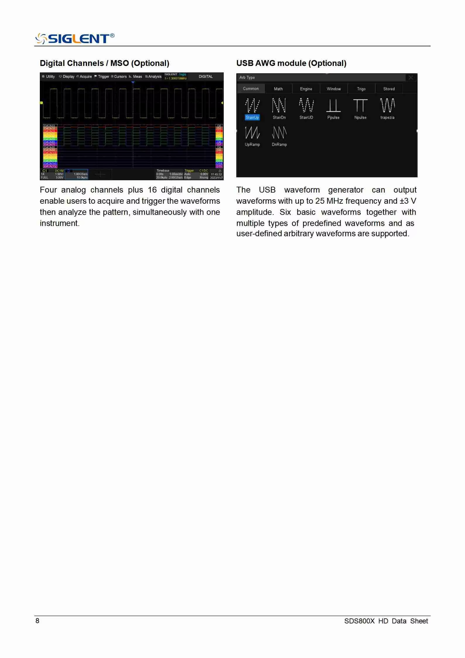 * Intelligent trigger: Slope, Pulse width, Window, Runt, Interval, Dropout, Pattern, Video (HDTV supported), ualified, Nth edge, Delay