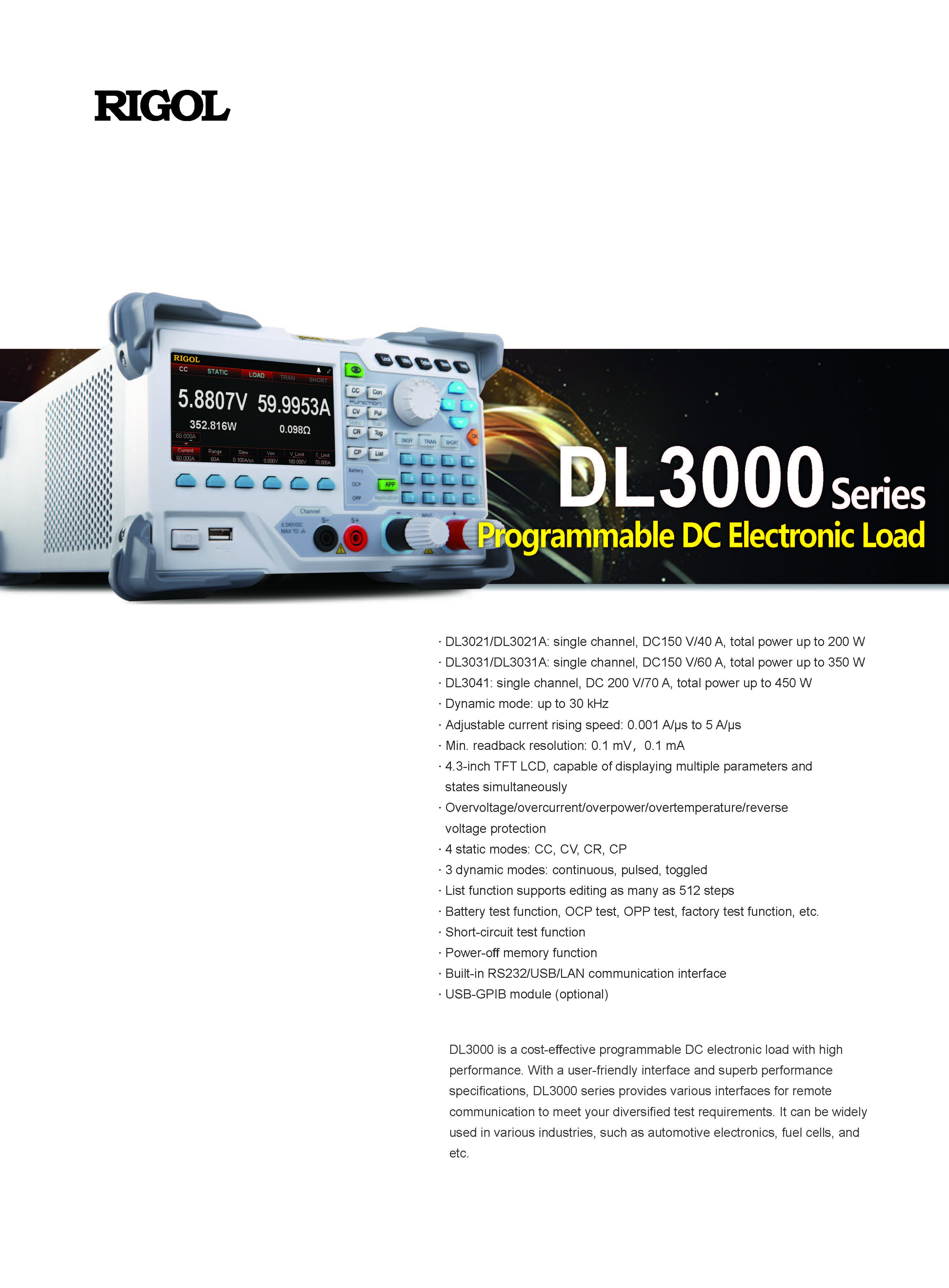 RIGOL DL3021 单通道可编程直流电子负载 200W/150V/40A/15kHz 带 4.3 英寸 TFT LCD