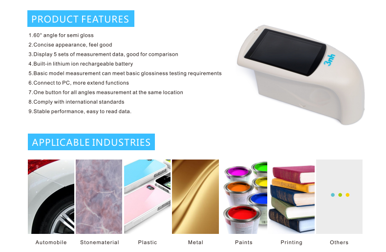 HG60 gloss meter is widely used to test glossiness in these industries, such as automobile, paint, ink, stoving varnish, coating, wood products; marble, granite, vitrified polished tile, pottery brick and porcelain; plastic, paper; hardware industries, etc.