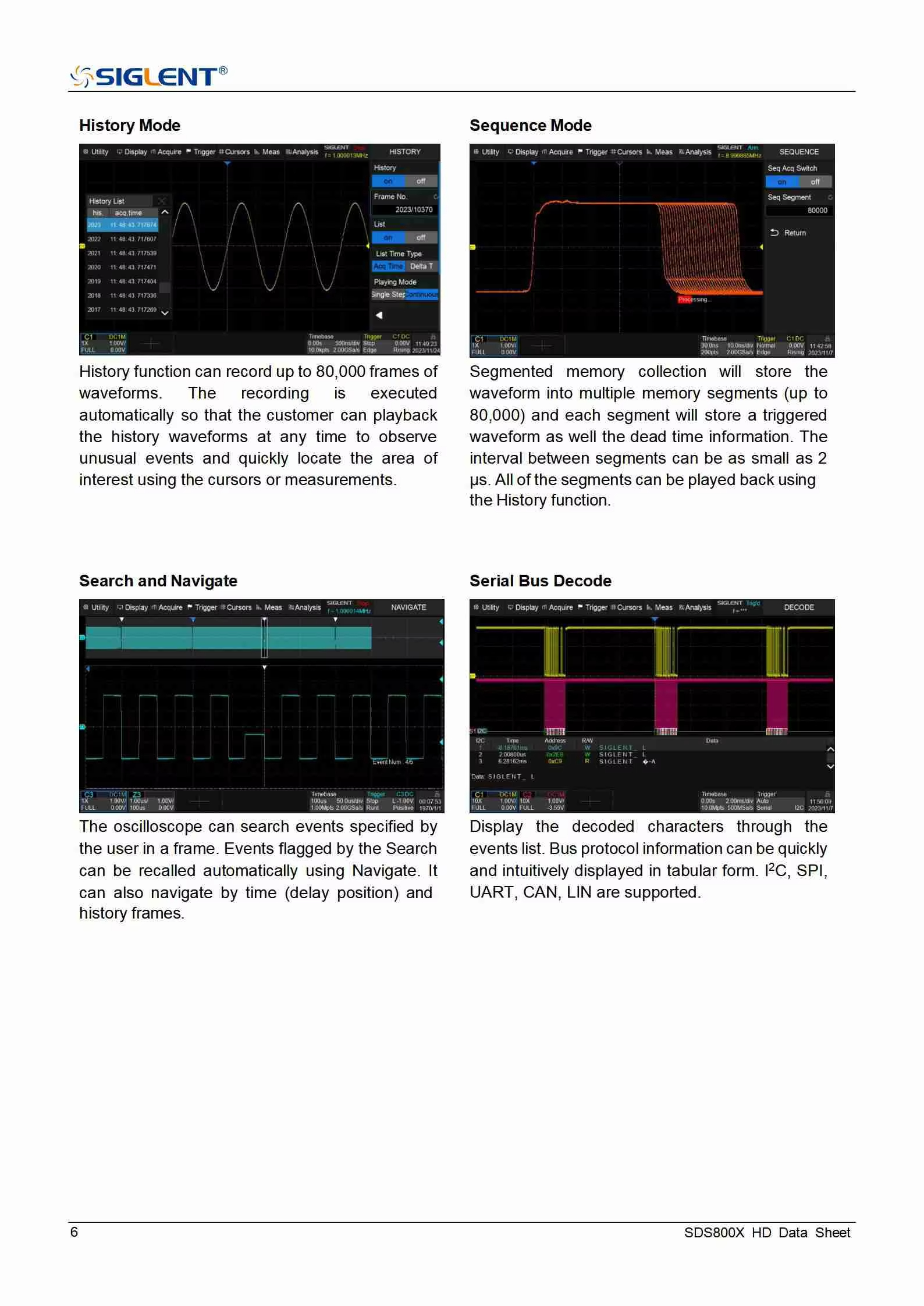 * Serial bus triggering and decoder: supports protocols I²C, SPI, UART, CAN, LIN