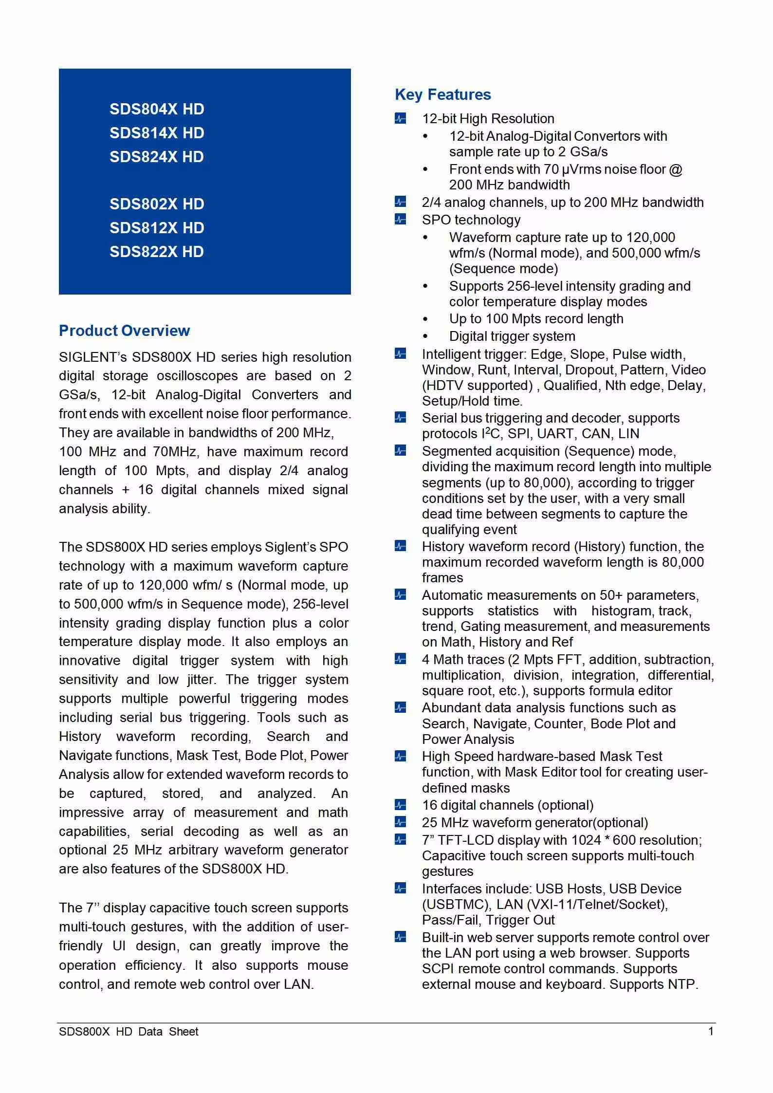 The SIGLENT SDS800X HD series is a high-resolution digital storage oscilloscope. It is built on 2 GSa/s, 12-bit Analog-Digital Converters with excellent front-end noise performance. Available in bandwidths of 200 MHz, 100 MHz, and 70 MHz, it offers a maximum record length of 100 Mpts and features 2/4 analog channels + 16 digital channels for mixed-signal analysis.
