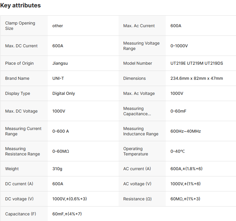 UNI-T UT219E 真有效值专业钳形表,交流电流 600A