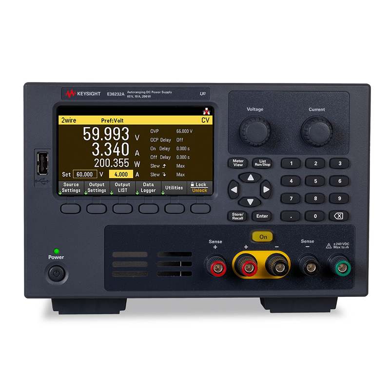 Designed for Your Power-Hungry DevicesThe Keysight E36200 Series autoranging bench power supply can power devices that typically require higher output power supplies with larger watt ratings. A single output E36200 Series autoranging bench power supply can power devices requiring up to 200 W. In comparison, a dual output supply provides two independent 200 W outputs that can combine into a single 400 W output. Three technologies generate higher current at more voltages: autoranging, auto-series, and auto-parallel. All four models use autoranging outputs to provide maximum current at all voltages. Auto-series and auto-parallel internally combine the outputs of the dual output models, creating a single 400 W output.Use autoranging power supplies that produce more current at all voltages levels.Get auto-parallel outputs for higher current up to 40 A.Apply auto-series combined outputs for higher voltage up to 120 V.Control inrush current with the variable slew rate. Acquire device protection by using overvoltage, overcurrent, and overtemperature provide device protection.Benefit from < 350 µVrms for low ripple and noise output.Improve load regulation with a four-wire sense. Measure power over time with a built-in data logger.Simplify USB, LAN (LXI Core), and optional GPIB connectivity.