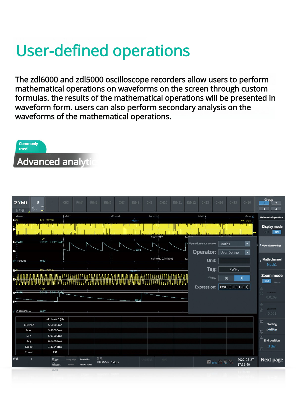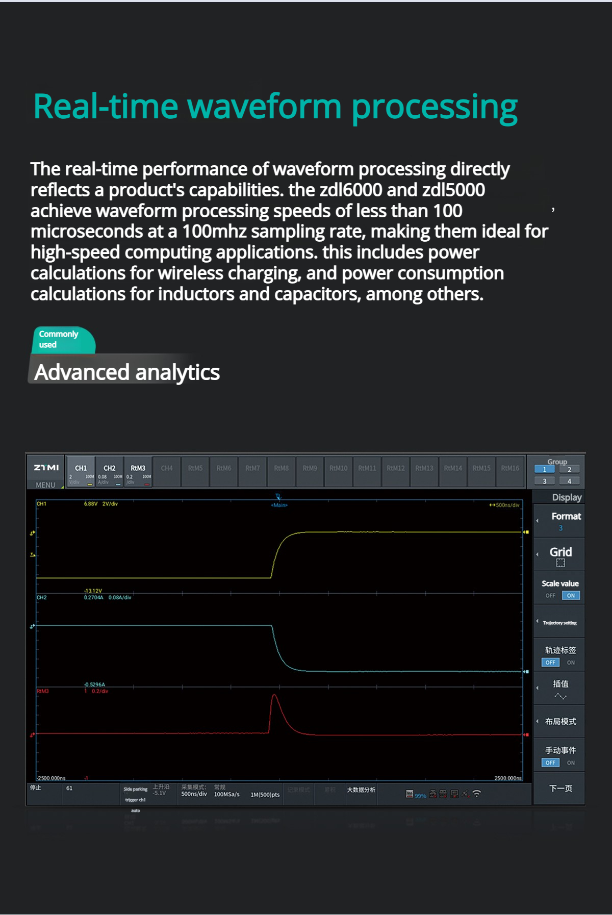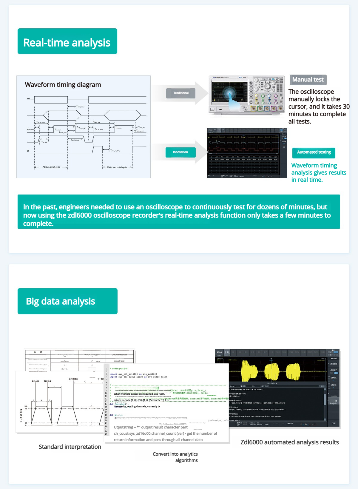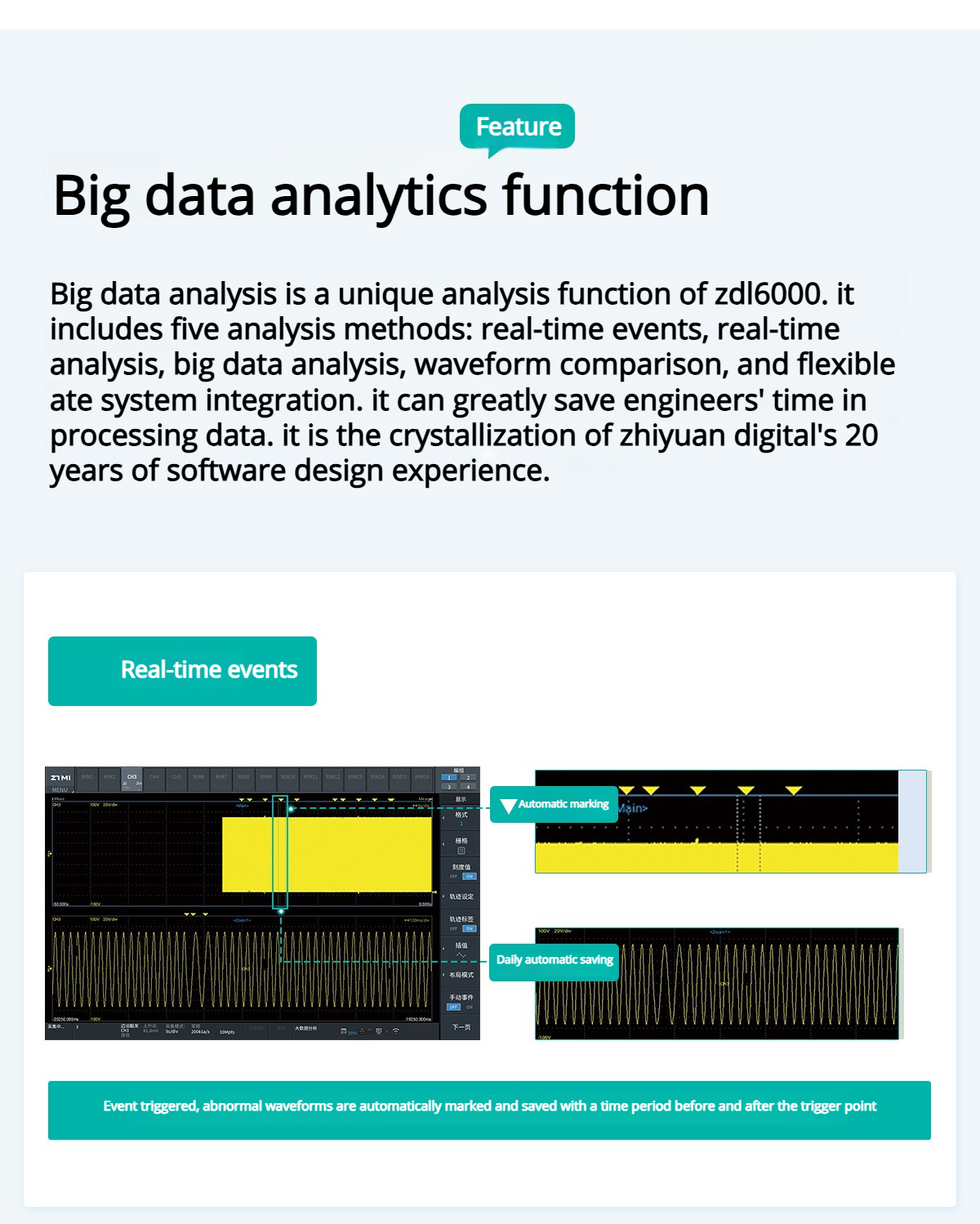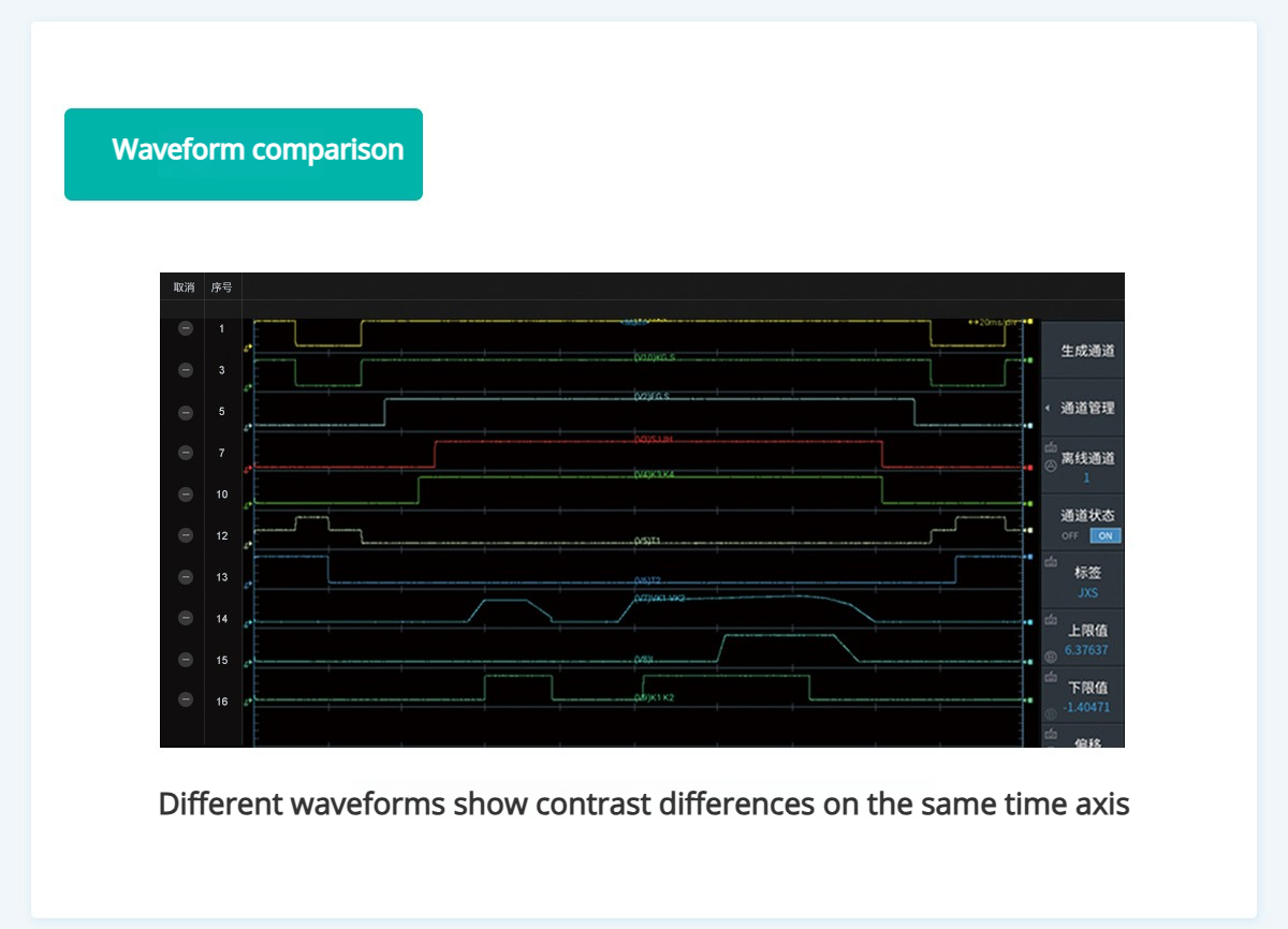 Big data analysis is a unique analysis function of ZDL6000. It includes five analysis methods such as real-time events, real-time analysis, big data analysis, waveform comparison, and flexible ATE system integration. This can significantly save the time of engineers in processing data and is the crystallization of Zhiyuan Electronics' 20 years of software design experience.