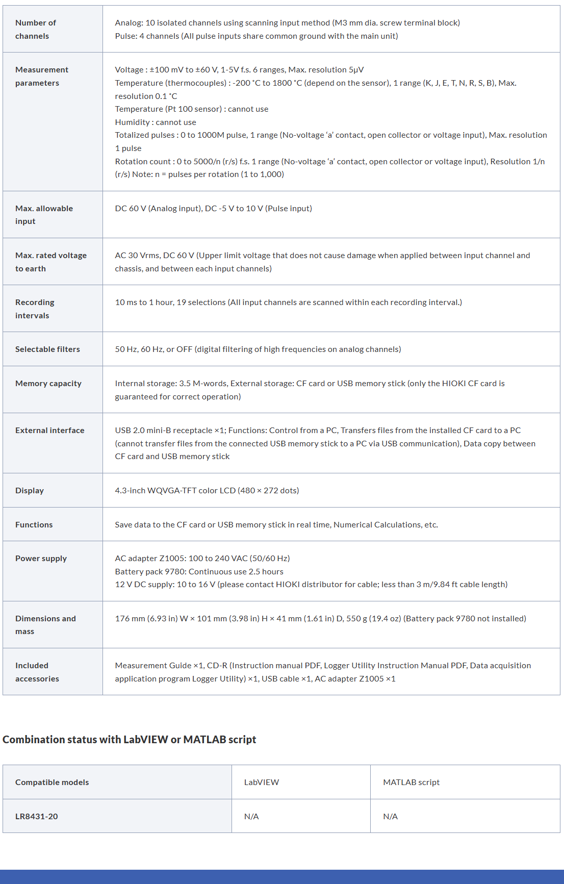 HIOKI MEMORY HiLOGGER LR8431 带有 4.3 英寸 WQVGA-TFT 彩色液晶显示屏 OBM 定制支持 1 小时录音间隔 1 年保修