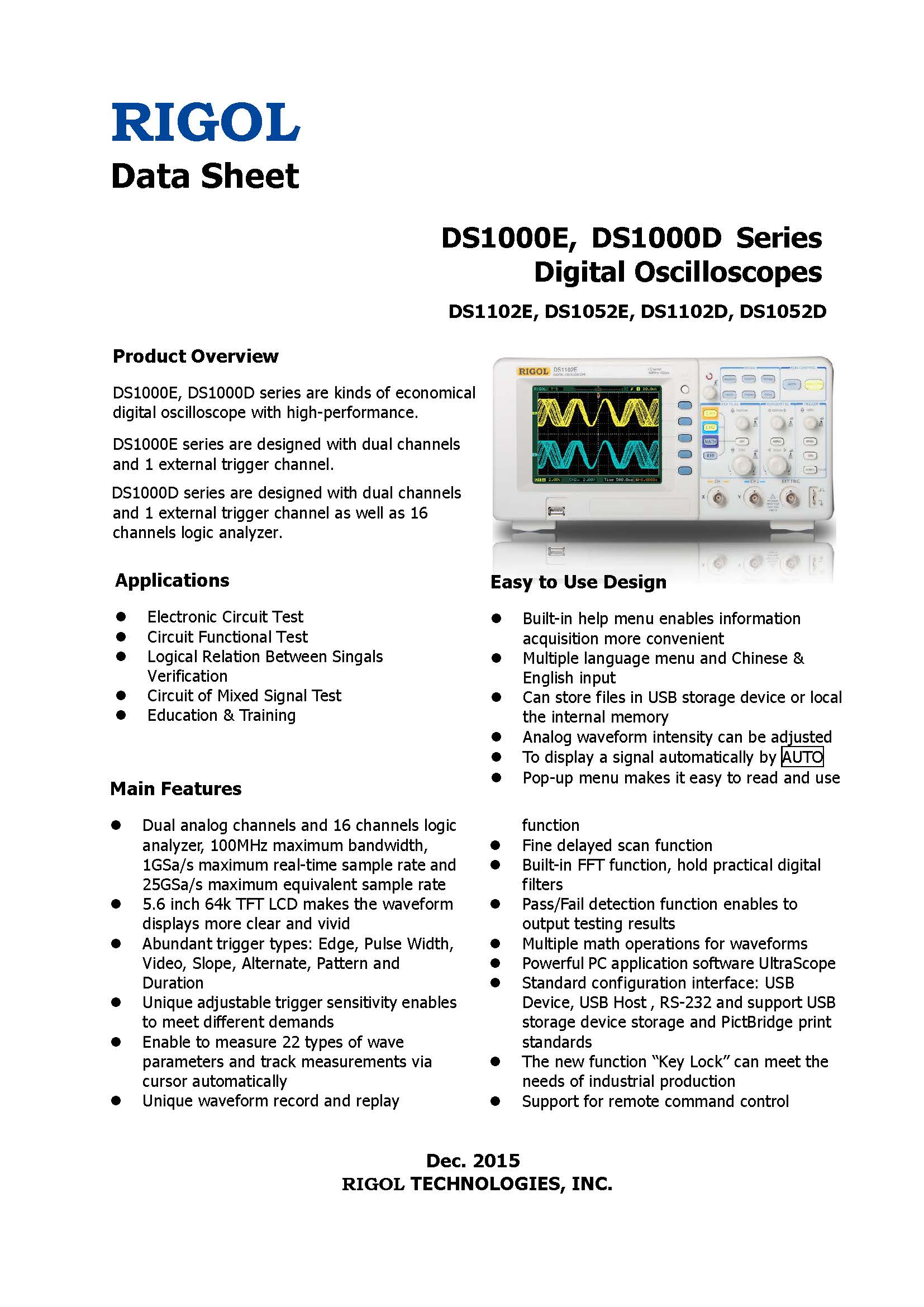 RIGOL DS1052E 50MHz 数字示波器,带 2 通道 USB 1GSa/s 采样率