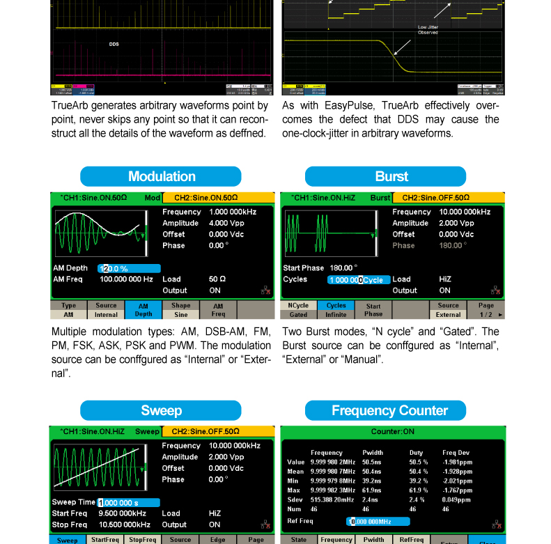 * Innovative TrueArb technology, outputting arbitrary waves point - by - point. Without losing waveform details, it can output low - jitter waveforms of any length within the range of 2 pts - 16 kpts at a variable sampling rate of 1 μSa/s - 30 MSa/s