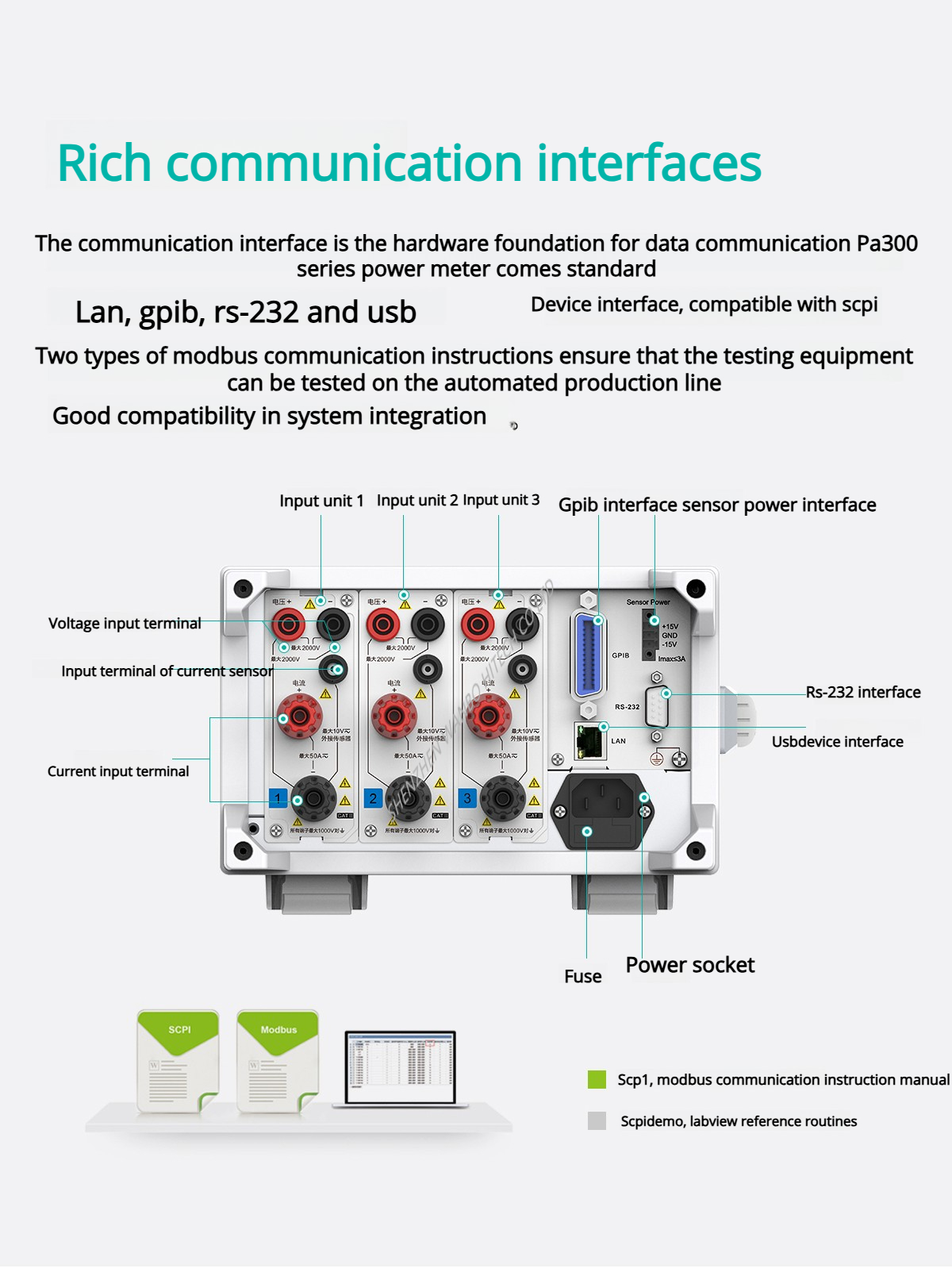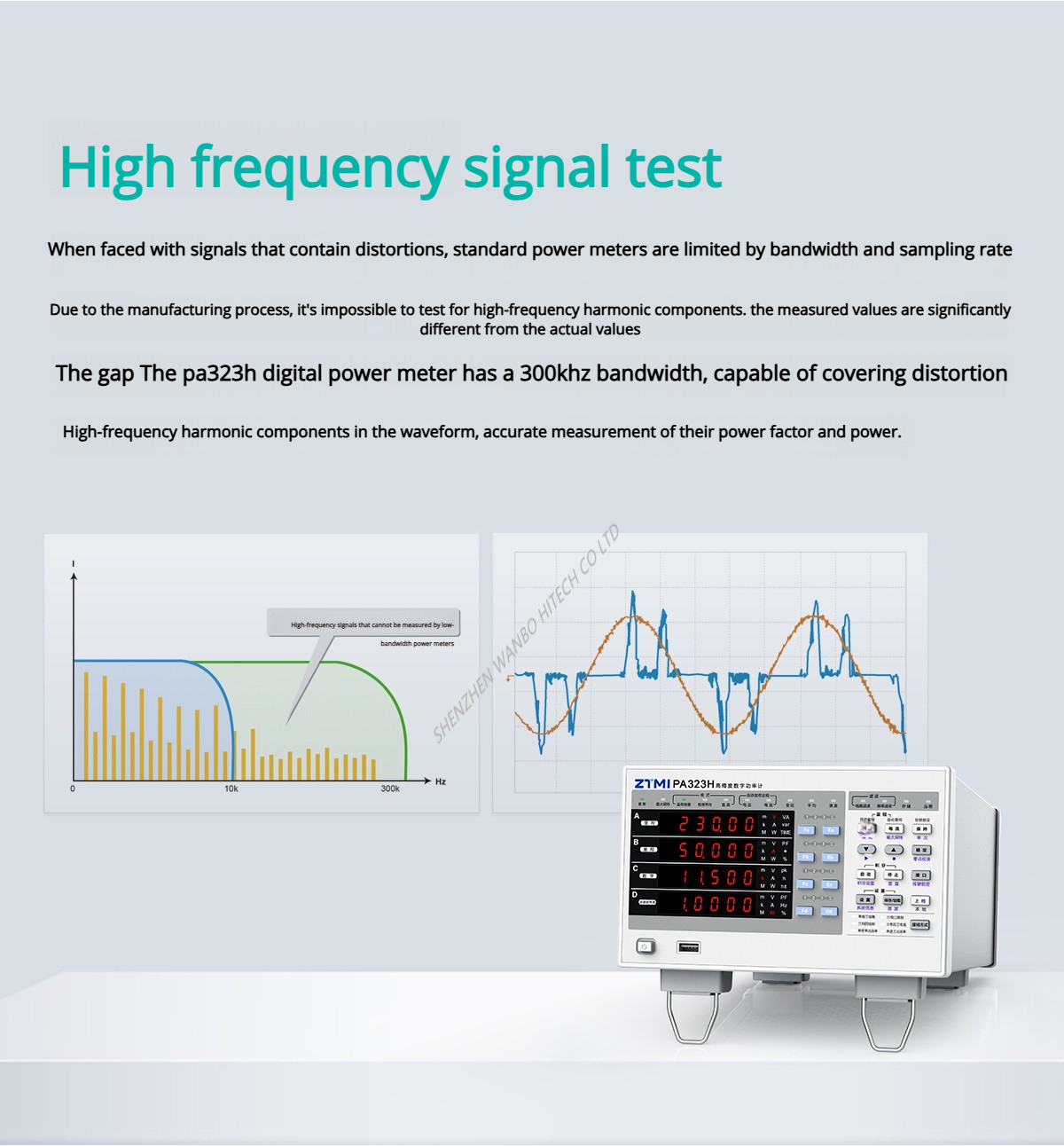 When dealing with distorted signals, ordinary power meters are unable to test the high-frequency harmonic components due to the limitations of their bandwidth and sampling rate, resulting in a significant deviation between the measured value and the true value. The PA323H digital power meter has a 300KHz bandwidth, which can cover the high-frequency harmonic components in distorted waveforms and accurately measure their power factor and power.