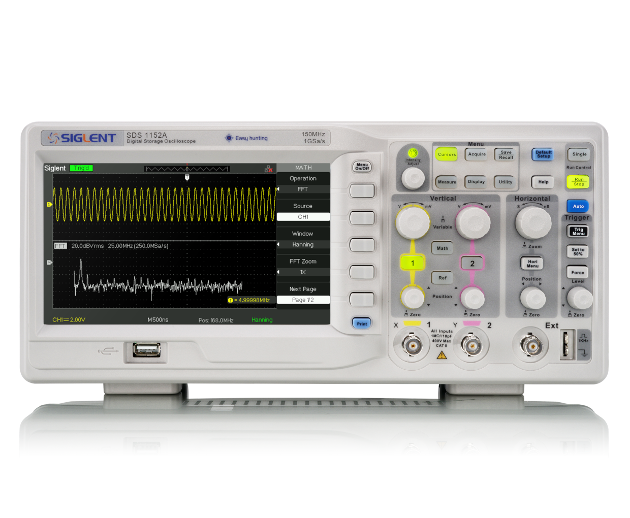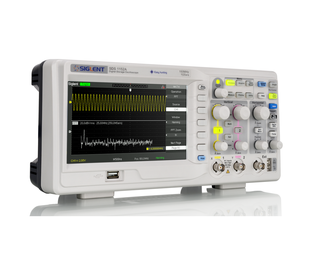 The SDS1000A series is a popular dual-channel digital oscilloscope product, available in models with bandwidth ranging from 50 MHz to 200 MHz. It features a memory depth of up to 2 Mpts (for the long-storage models of the SDS1000A series), ensuring fine waveform resolution while capturing long signals. Equipped with a 7-inch color TFT-LCD (800*480) screen, it helps you better insight into signal details. The 1 GSa/s sampling rate allows you to easily capture transient signals. The simple operation interface ensures the usability of the oscilloscope. Additionally, 32 types of automatic parameter measurement functions and common mathematical operation functions greatly improve work efficiency, enabling you to easily meet the measurement needs of