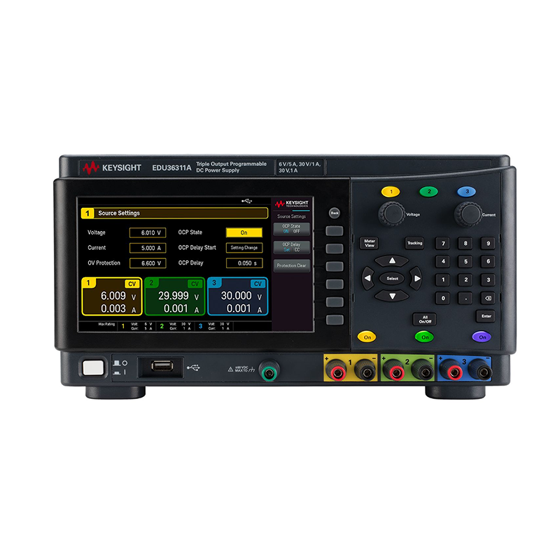 Combine Triple Outputs with Powerful Software for Deeper InsightsThe Keysight Smart Bench Essentials (SBE) Series is a set of four unique instruments with PathWave BenchVue application software to connect, control, and capture measurement data.The EDU36311A triple-output power supply has a compact design to fit anywhere on your bench. Monitor all your outputs simultaneously from any angle with its 7-inch color display. Each output is independent — connect your outputs in a series for higher voltage, in parallel for additional current, or stack to provide 0 to ±30 V. A sequencing feature enables and disables outputs in a set pattern. You can now activate the control logic before applying power to the rest of your device.Download BenchVue Basic app for free to control your instruments.Get Keysight's PathWave BenchVue power supply software for remote control and data loggingAchieve ripple and noise at <1mVrms for low noise outputExperience accurate current and voltage control with excellent programming and readbackMeasure with confidence using exceptional line and load regulation for a stable outputSave configurations for repeat test setups with the USB flash driveSimplify connectivity with USB and LAN (LXI Core)