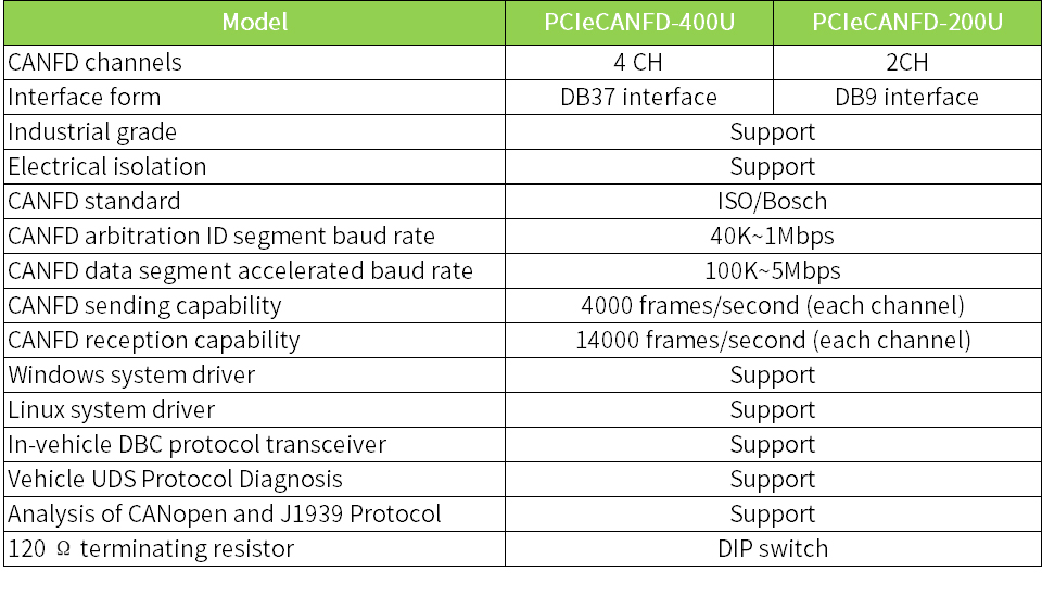 PCIeCANFD series is a high-performance CANFD interface card developed by Guangzhou Zhiyuan Electronics Co., Ltd. Integrate 2-4 channel CANFD interface, support ISO standard CANFD and Bosch CANFD standard. Each interface has an independent 2500VDC electrical isolation protection circuit, which can prevent the interface card from being damaged due to ground circulation and enhance the reliability of the system in harsh environments.