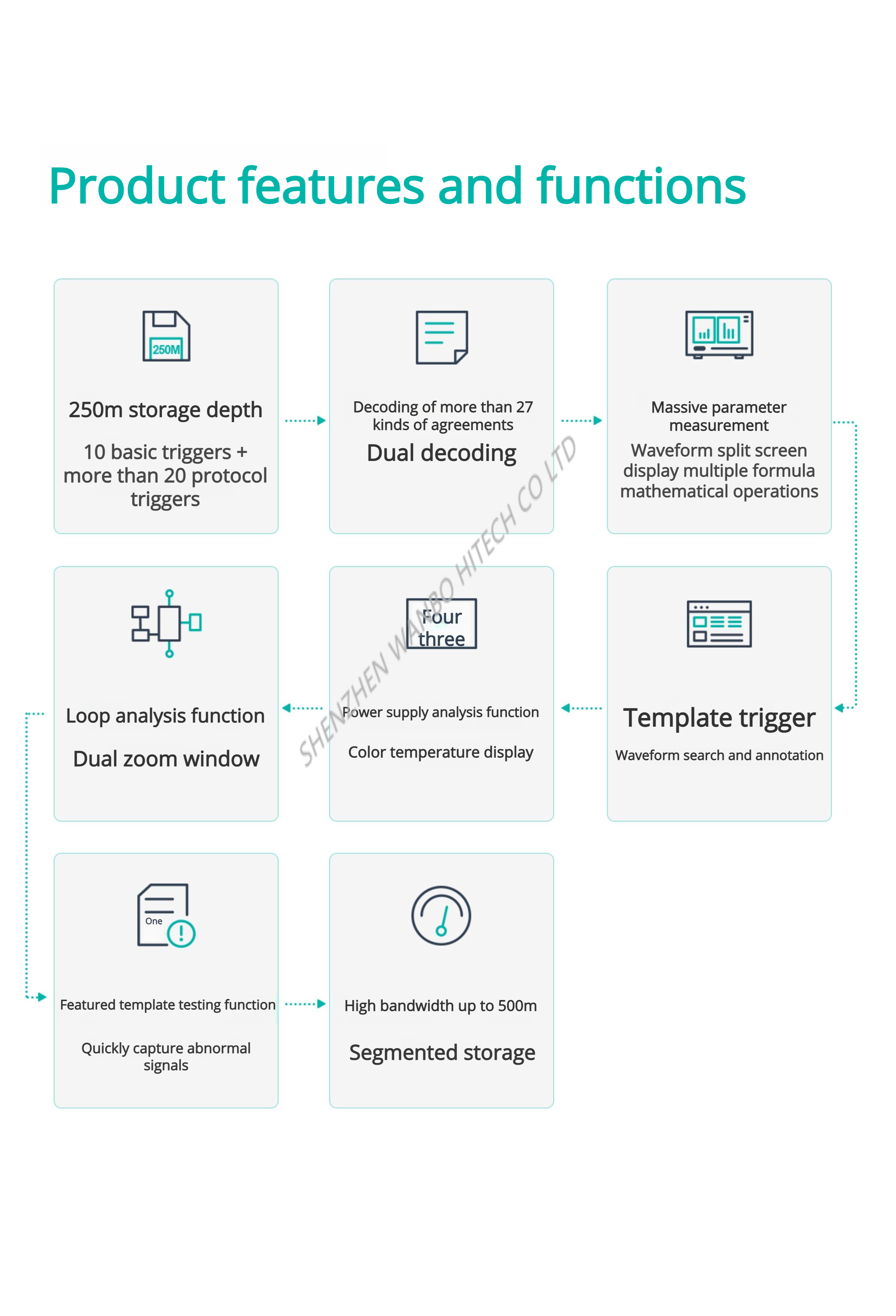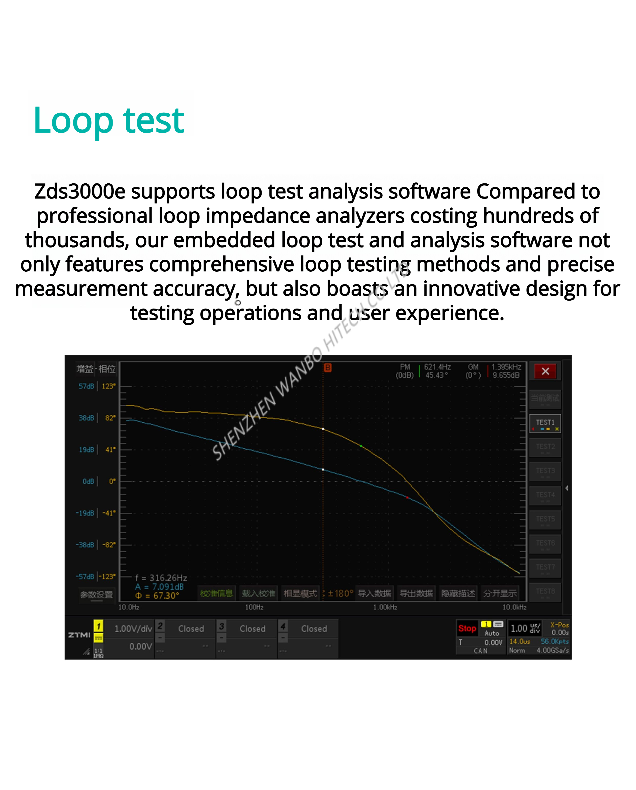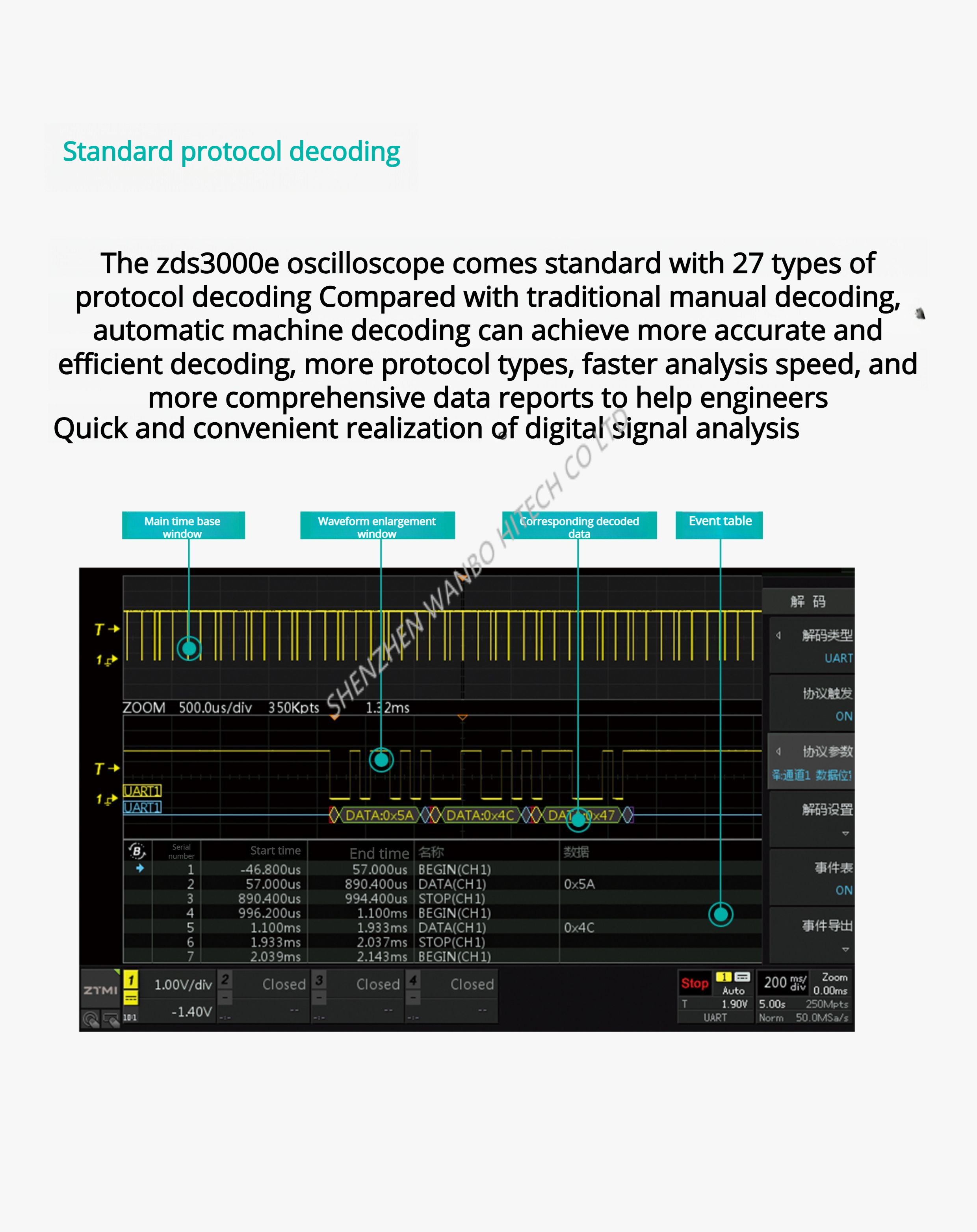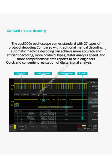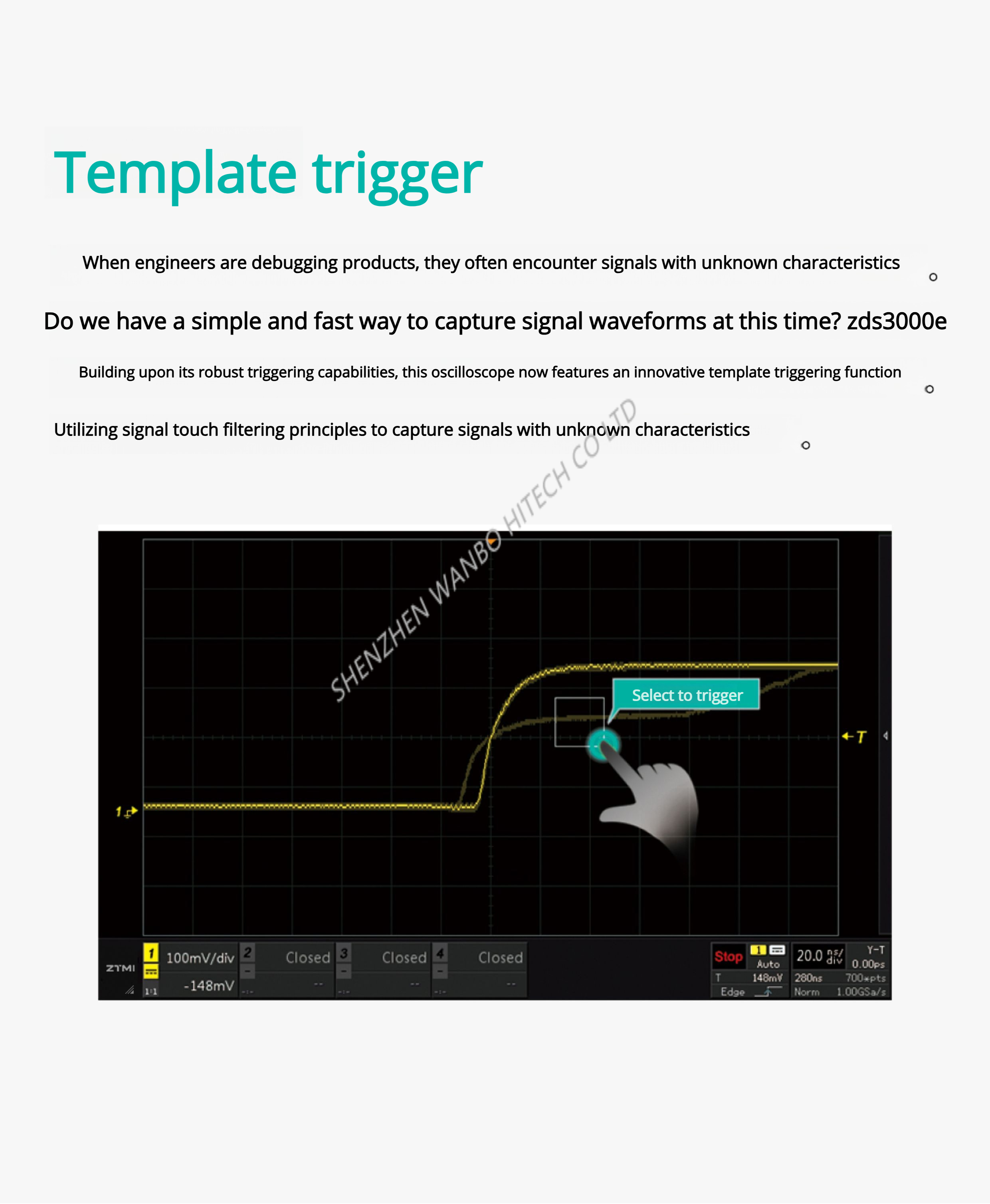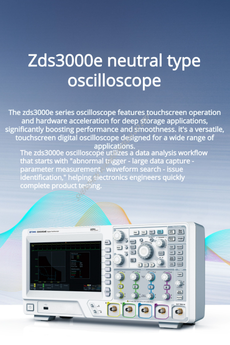 The ZDS3000E series oscilloscopes support touchscreen operation and have undergone hardware acceleration processing based on deep storage applications, resulting in significant improvements in performance and smoothness. It is a universal touchscreen digital oscilloscope. The ZDS3000E oscilloscope uses the data analysis process of "exceptional triggering - large data capture - parameter measurement - waveform search - identifying the problem" to help electronic engineers quickly complete product testing.